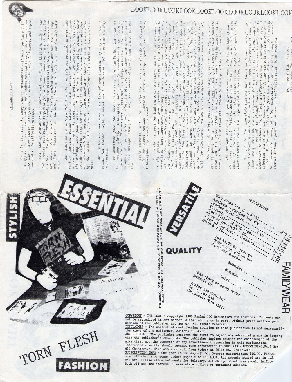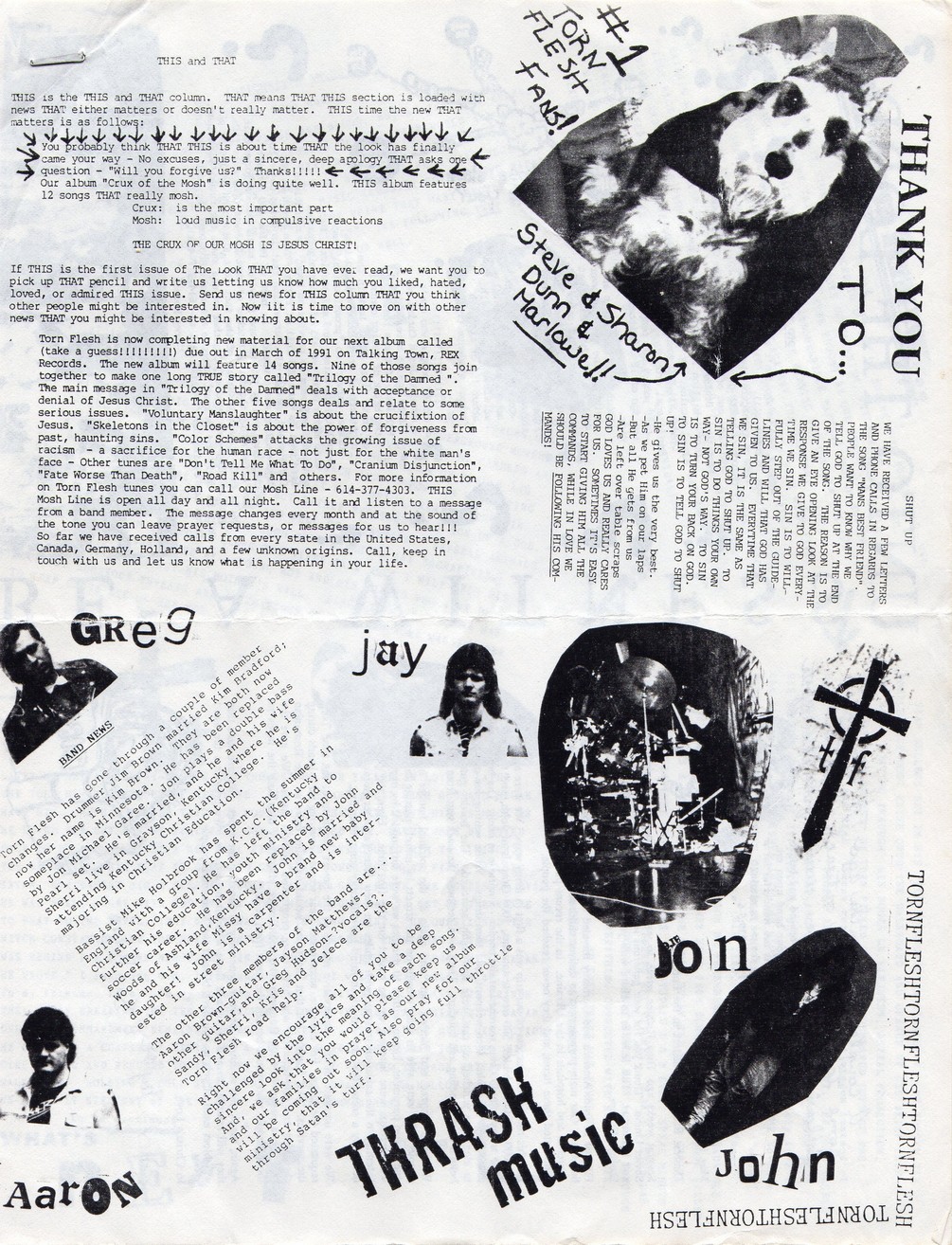 Torn Flesh is now completing new material for our next album called (take a guess!!!!!!!!!) due out in March of 1991 on Talking Town, REX Records. The new album will feature 14 songs. Nine of those songs join together to make one long TRUE story called "Trilogy of the Damned". The main message in "Trilogy of the Damned" deals with acceptance or serious issues. "Voluntary Manslaughter" is about the crucifixtion of Jesus. "Skeletons in the Closet" is about the power of forgiveness from past, haunting sins. "Color Schemes" attacks the growing issue of racism -- a scrifice for the human race -- not just for the white man's face -- Other tunes are "Don't Tell Me What To Do", "Cranium Disjunction", "Fate Worst Than Death", "Road Kill" and others. For more information on Torn Flesh tunes you can call our Mosh Line -- 614-***-****. THIS Mosh Line is open all day and all night. Call it and listen to a message from a band member. The message changes every month and at the sound of the tone you can leave prayer requests, or messages for us to hear!!! So far we have received calls from every state in the United States, Canada, Germany, Holland, and a few unknown origins. Call, keep in touch with us and let us know what is happening in your life.