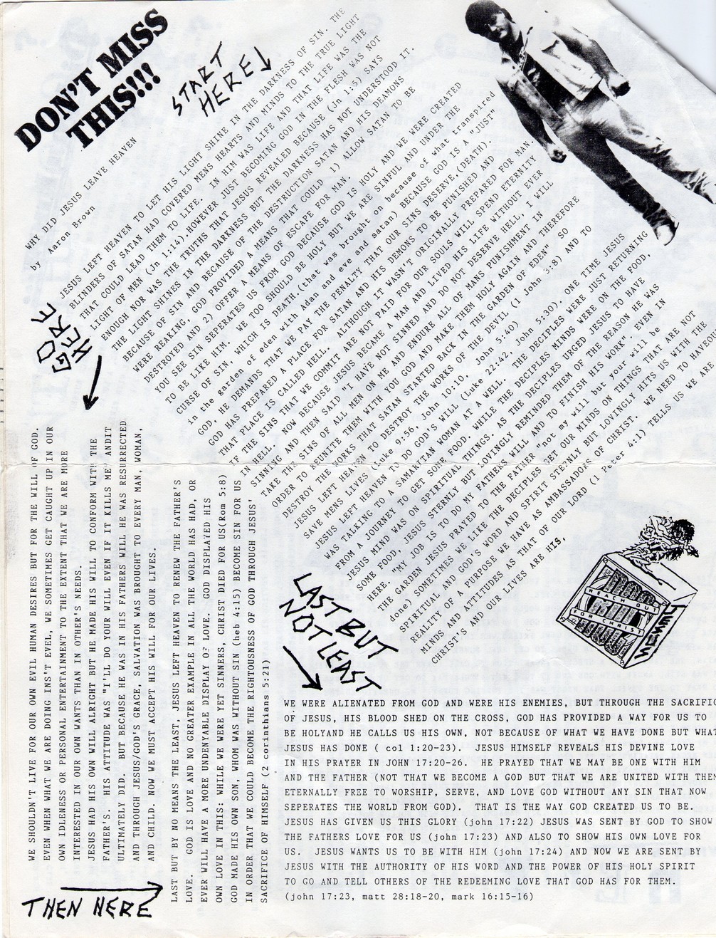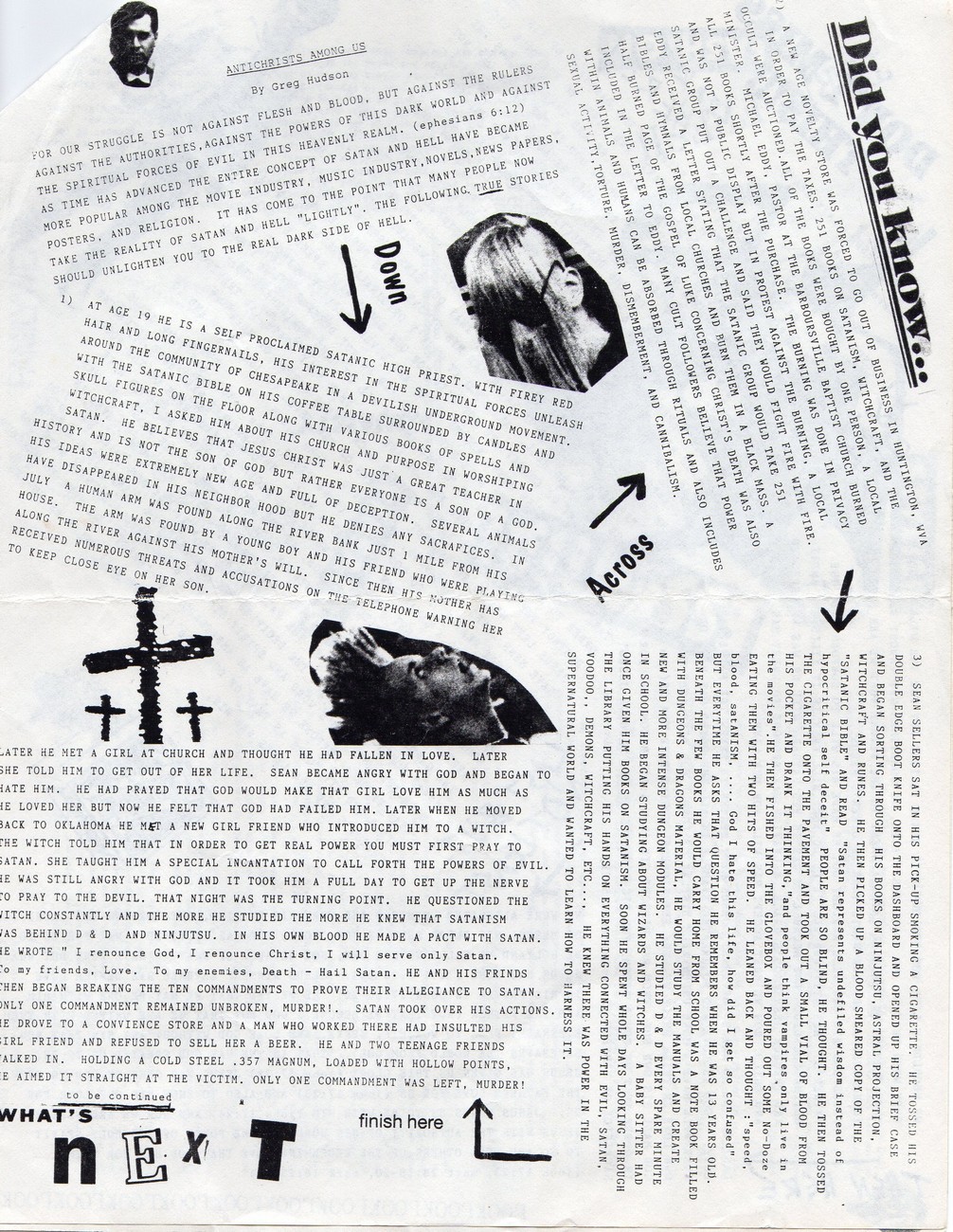 3) SEAN SELLERS SAT IN HIS PICK-UP SMOKING A CIGARETTE. HE TOSSED HIS DOUBLE EDGE BOOT KNIFE ONTO THE DASHBOARD AND OPENED UP HIS BRIEF CASE AND BEGAN SORTING THROUGH HIS BOOKS ON NINJUTSU, ASTRAL PROJECTION, WITCHCRAFT AND RUNES. HE THEN PICKED UP A BLOOD SMEARED COPY OF THE "SATANIC BIBLE" AND READ "Satan represents undefiled wisdom instead of hypocritical self deceit" PEOPLE ARE SO BLIND, HE THOUGHT. HE THEN TOSSED THE CIGARETTE ONTO THE PAVEMENT AND TOOK OUT A SMALL VIAL OF BLOOD FROM HIS POCKET AND DRANK IT THINKING, "and people think vampires only live in the movies". HE THEN FISHED INTO THE GLOVEBOX AND POURED OUTSOME No-Doze EATING THEM WITH TWO HITS OF SPEED. HE LEANED BACK AND THOUGHT: "speed, blood, satANISM, .... God I hate this life, how did I get so confused" BUT EVERYTIME HE ASKS THAT QUESTION HE REMEMBERS WHEN HE WAS 13 YEARS OLD. BENEATH THE FEW BOOKS HE WOULD CARRY HOME FROM SCHOOL WAS A NOTE BOOK FILLED WITH DUNGEONS & DRAGONS MATERIAL, HE WOULD STUDY THE MANUALS AND CREATE NEW AND MROE INTENSE DUNGEON MODULES. HE STUDIED D & D EVERY SPARE MINUTE IN SCHOOL. HE BEGAN STUDYING ABOUT WIZARDS AND WITCHES. A BABY SITTER HAD ONCE GIVEN HIM BOOKS ON SATANISM. SOON HE SPENT WHOLE DAYS LOOKING THROUGH THE LIBRARY PUTTING HIS HANDS ON EVERYTHING CONNECTED WITH EVIL, SATAN, VOODOO,, DEMONS, WITCHCRAFT, ETC.... HE KNEW THERE WAS POWER IN THE SUPERNATURAL WORLD AND WANTED TO LEARN HOW TO HARNESS IT.